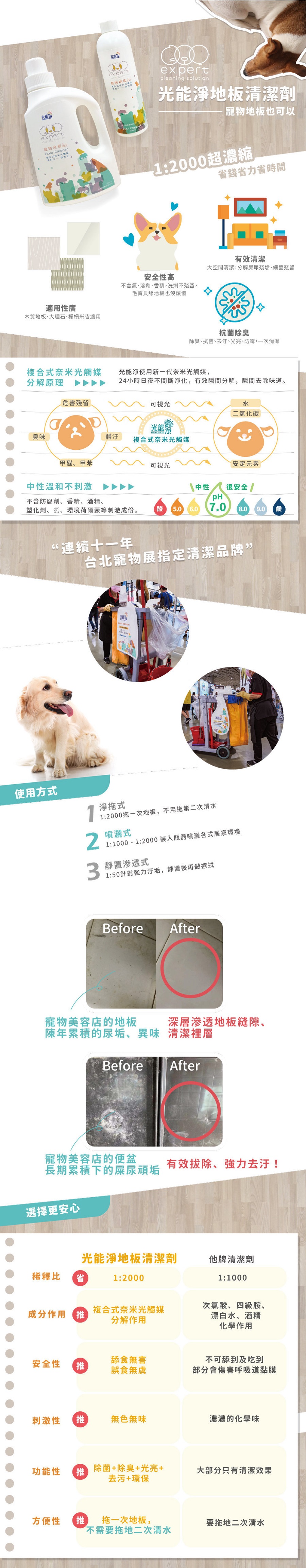同時具備深層清潔、除甲醛、除臭、除菌等多種功能,複合式奈米光觸媒可深層滲透地板裡層,甲醛、陳年累積的尿垢、異味、細菌等有效拔除、強力去汙!