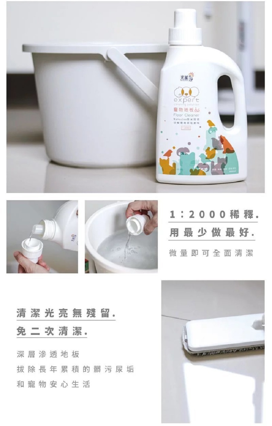 3.淨拖式-1:2000稀釋後使用乾淨拖把、抹布直接拖地、擦拭,不需再用清水拖一遍
