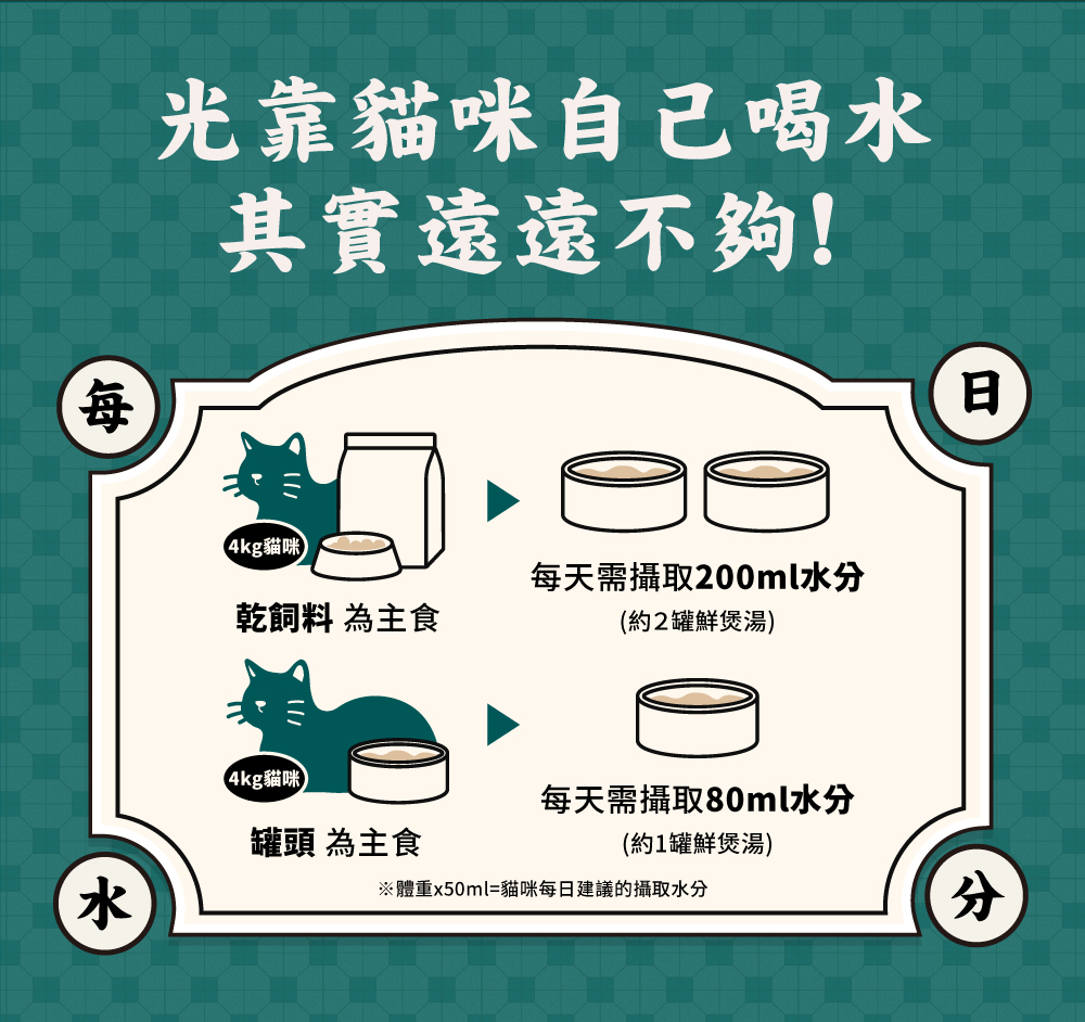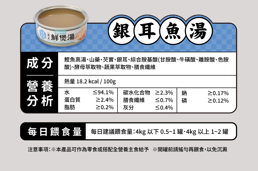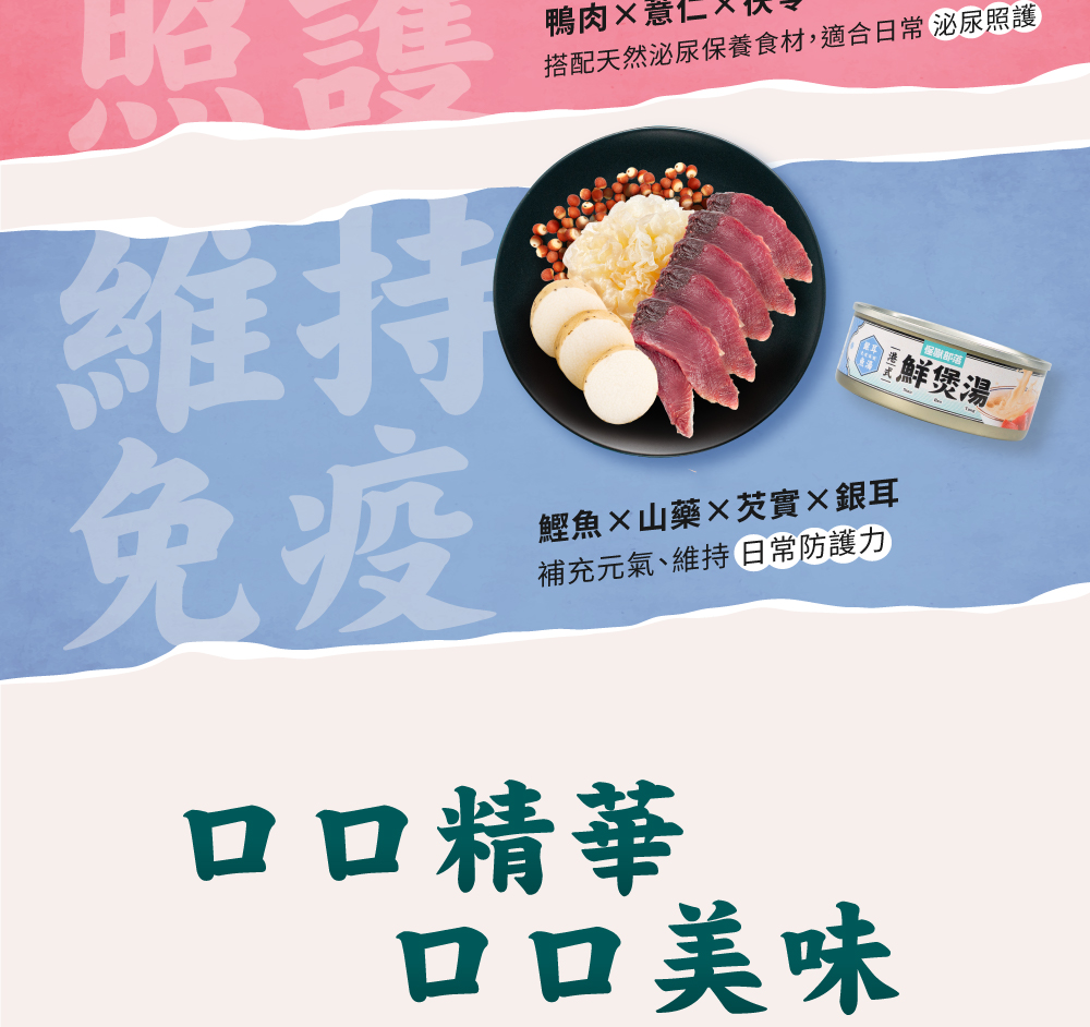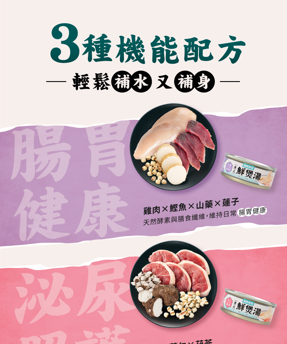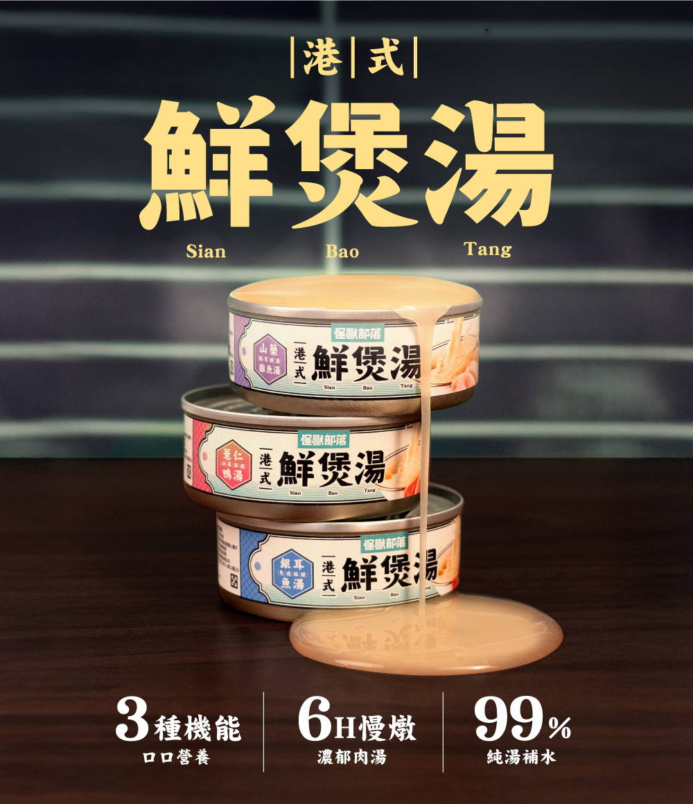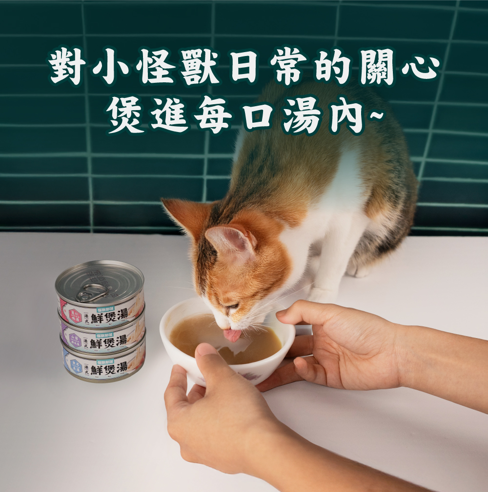 鮮煲湯以高比例的湯汁為主,適合作為日常補水的輕盈選擇;若貓咪喜歡咬咬、增添飽足感,可以選擇肉含量較高的其他副食罐喔!